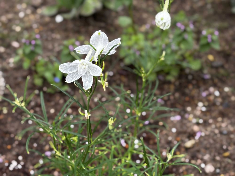 ④お花屋さんでもらったデルフィニウムハンキードリー。背が低めなのがうれしい。
