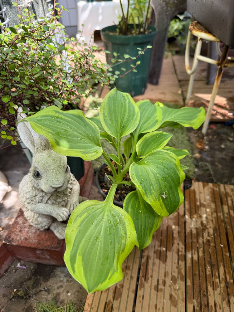 雨上がりのバルコニー。ホスタの葉っぱの陰で雨宿りしていたうさぎさんです。