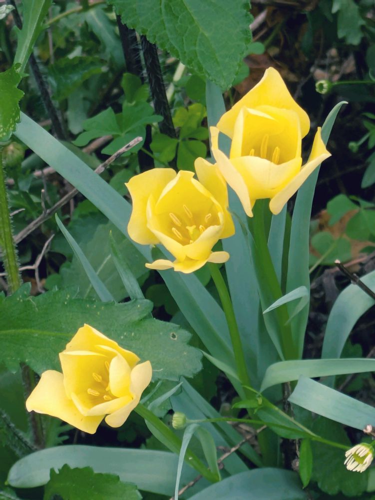 レンギョウが散り、菜の花が散りかけ、今はモッコウバラと原種チューリップが盛りです