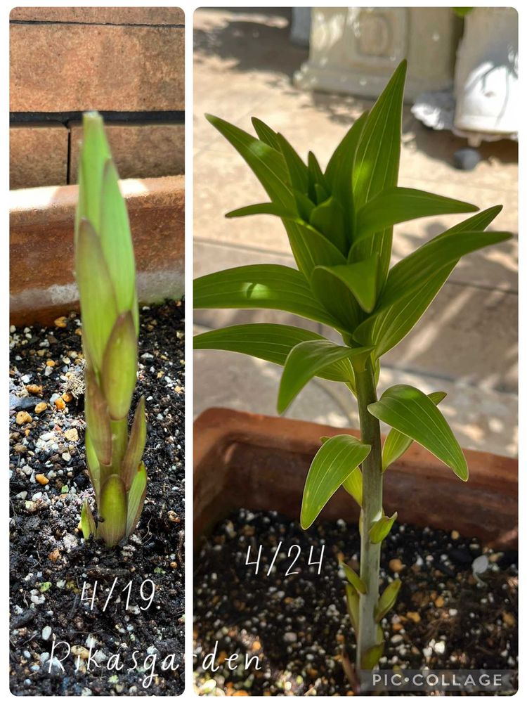 ④カネコ種苗さんから、頂いたカサブランカの芽がでてきました。日に日に大きくなっています🙌