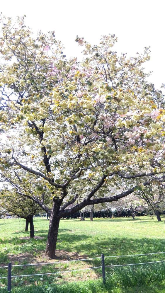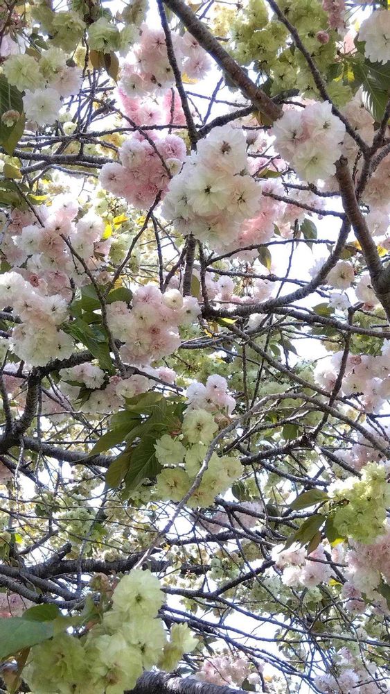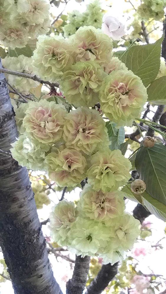 ほんとに素敵な八重桜で ひとつの木に黄緑と淡紅色が咲いてます