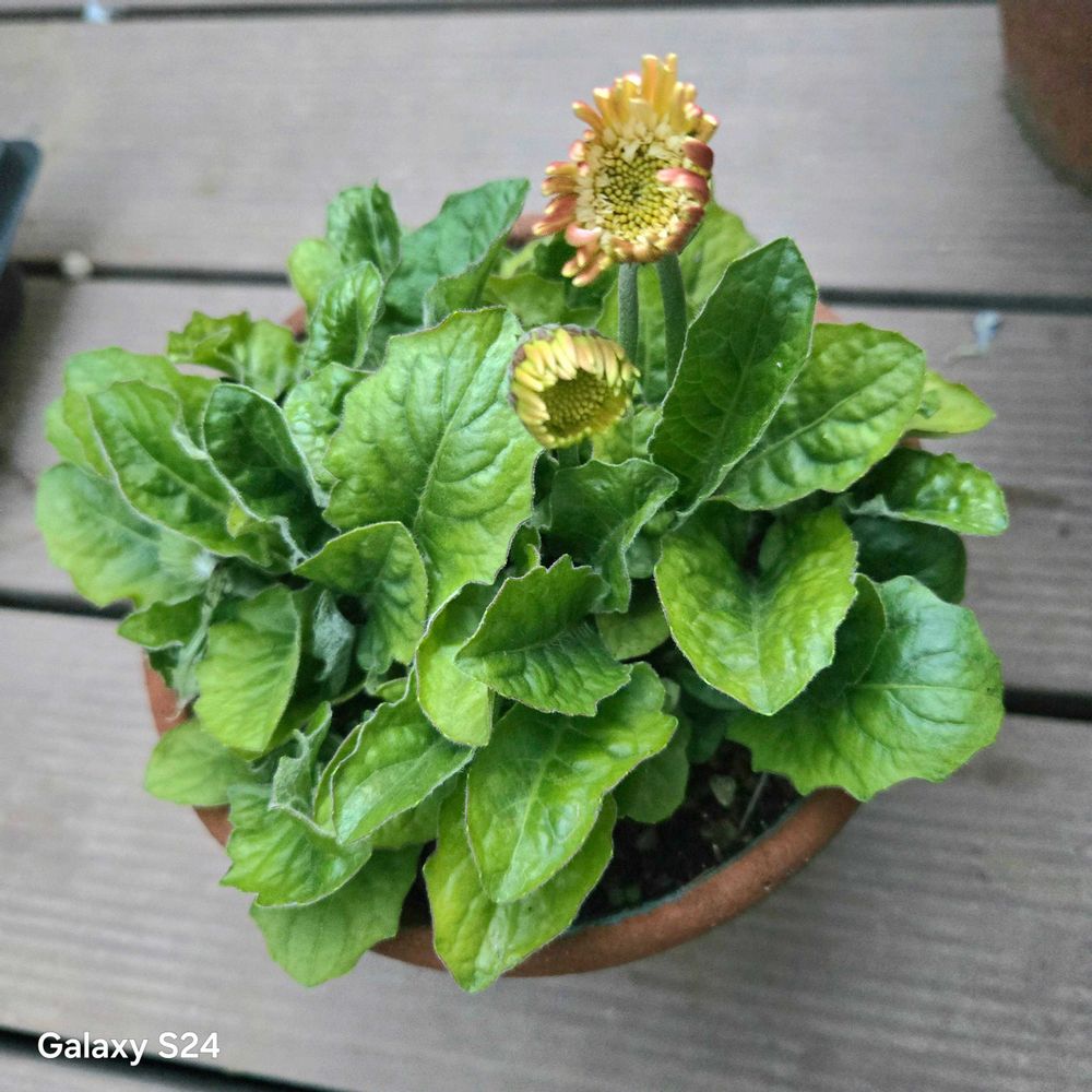 🤓:「我が家も枯れてる鉢植えからガ―ベラのつぼみ(実はピンク)が出てきて葉も数は少ないですけどつぼみと共に生育してきてます💚💛💚」