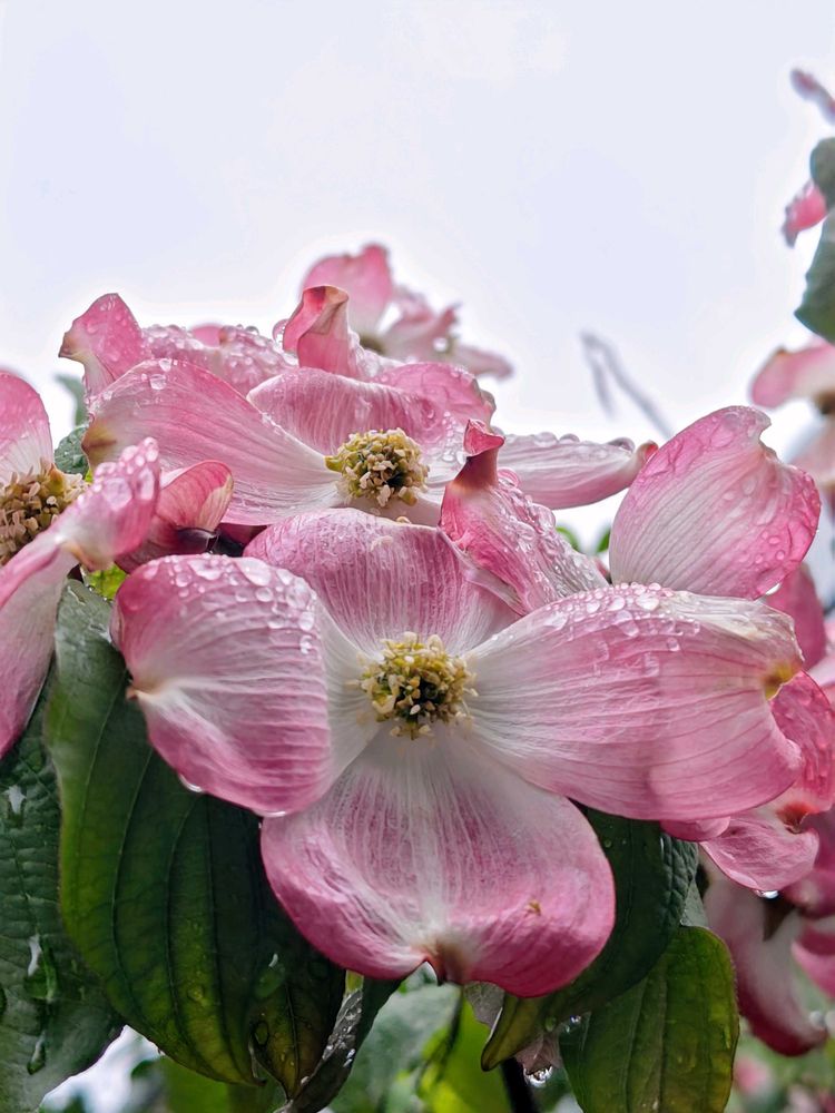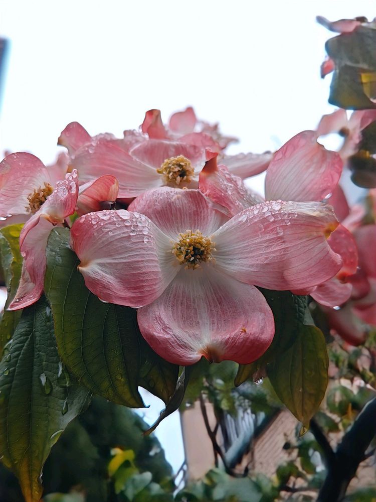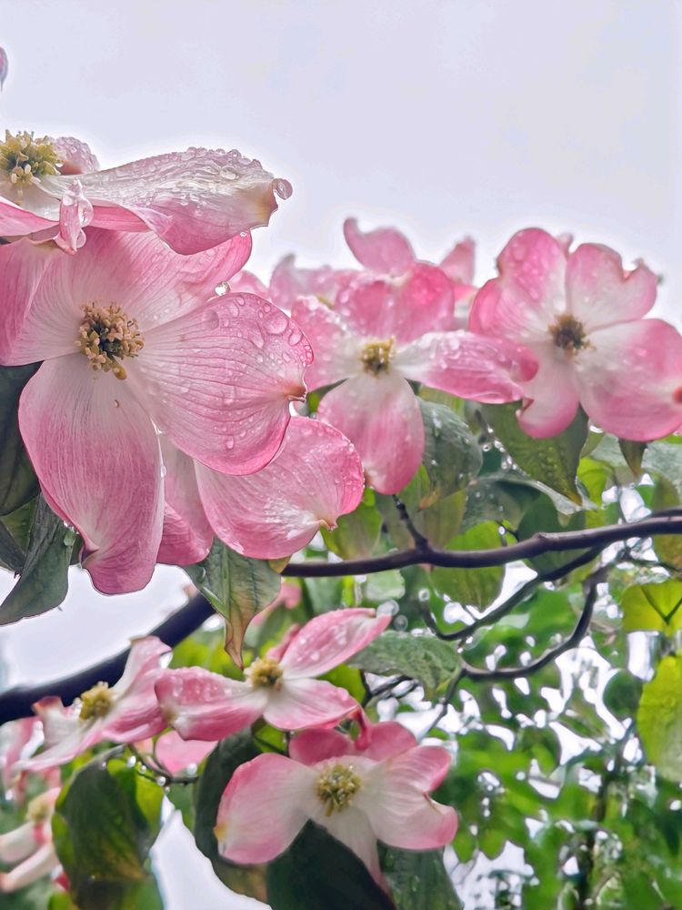 雨粒💧をまとったお花たち。ハナミズキ。公園に行く途中、見上げたハナミズキ💕