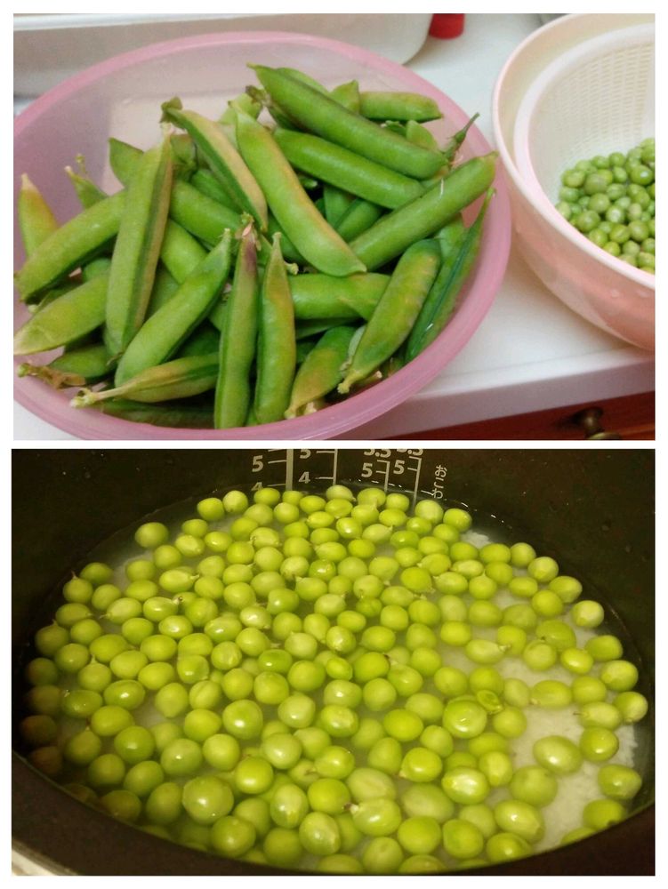 このグリーンピース💚古代エジプトの豆遺伝子がちょっぴり残ってて 保温してあったらお米が赤飯みたいになってるんですよ~❤