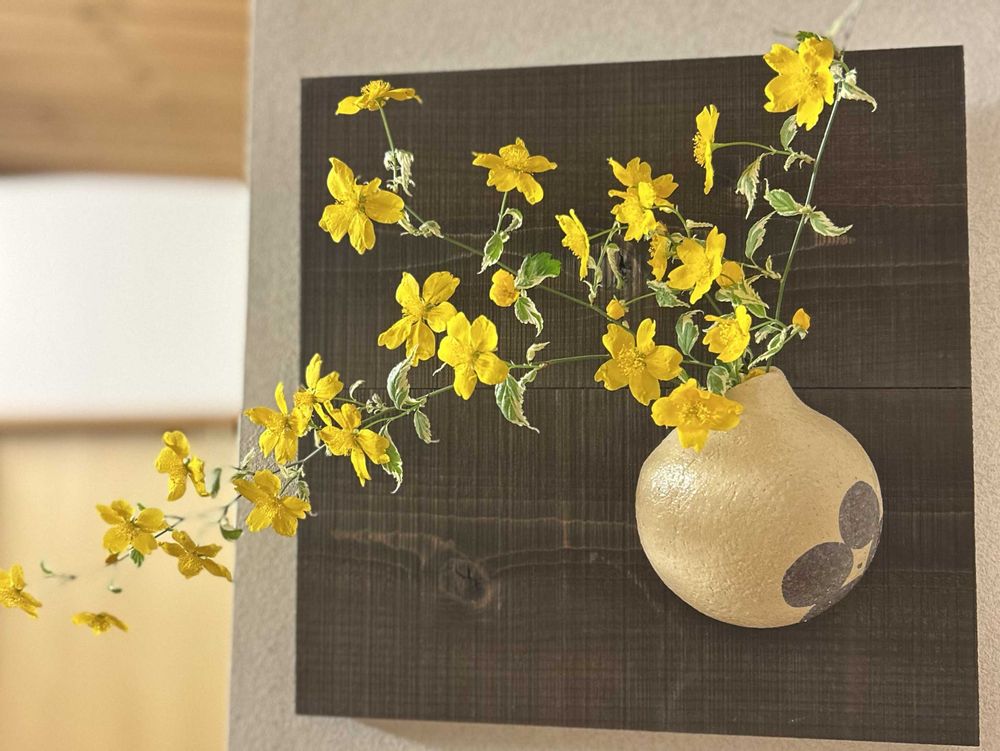 いつもの壁掛け器にヤマブキの枝と花がよく似合いますね✨👍