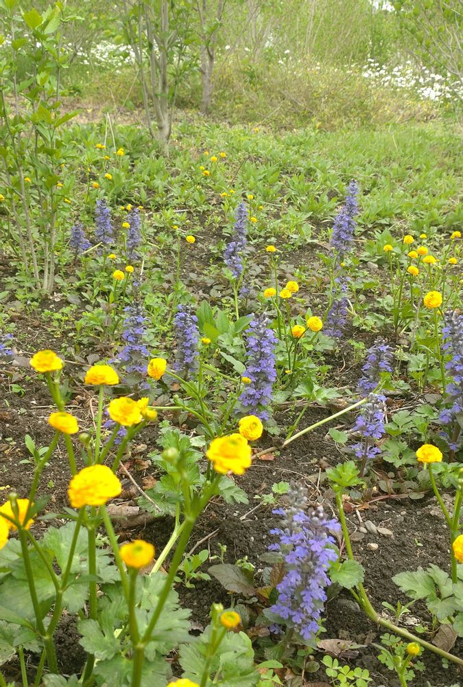 ゴールドコインの黄色、アジュガの紫、遠くにはフランス菊の白?