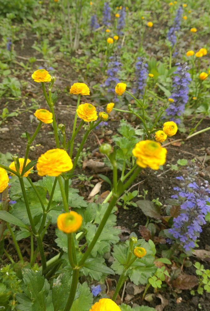 今年も 庭の ラナンキュラス(ゴールドコイン)&アジュカさんが 咲き始めました(*^^*)💛💜