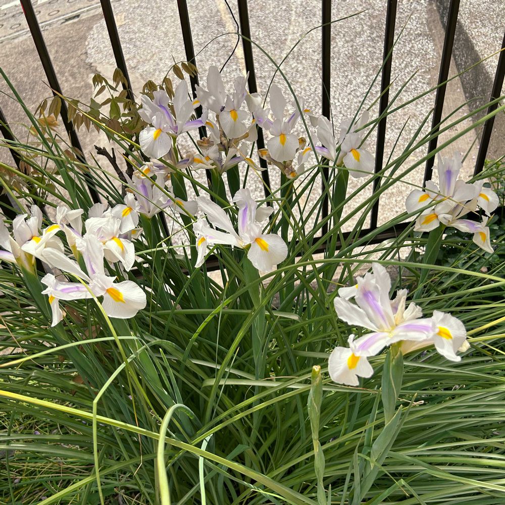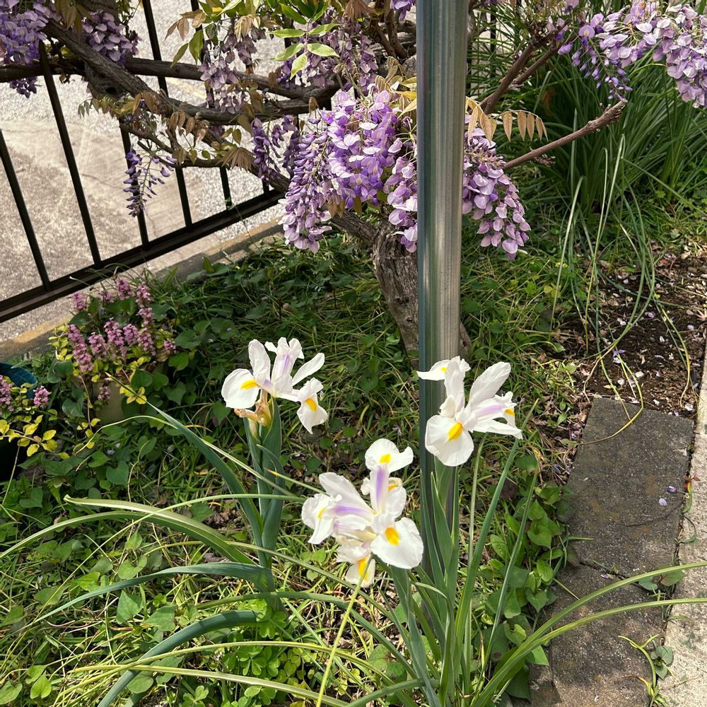藤の隣で毎年花を咲かせてくれるアイリス?なのですが、咲き始めに紫の花が一輪咲いたのですが、その後は白花だけが咲いています。