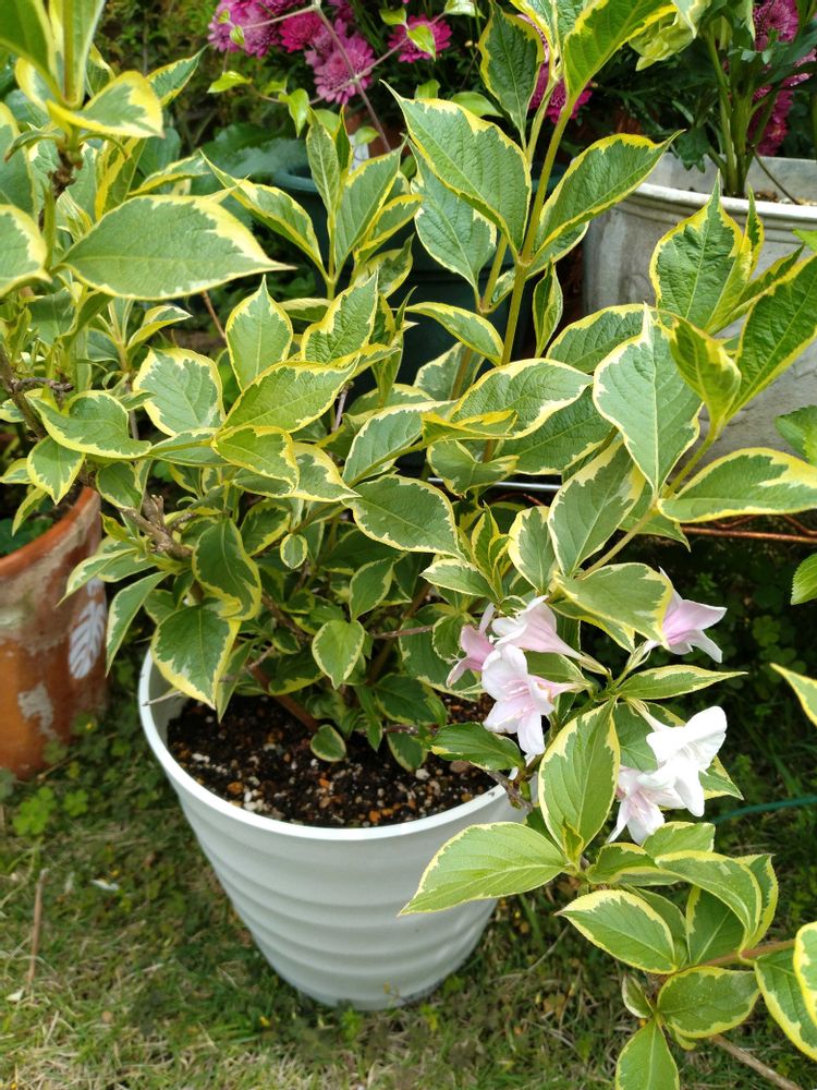 去年の春に苗木を買って鉢で育てた、斑入りのハコネウツギ