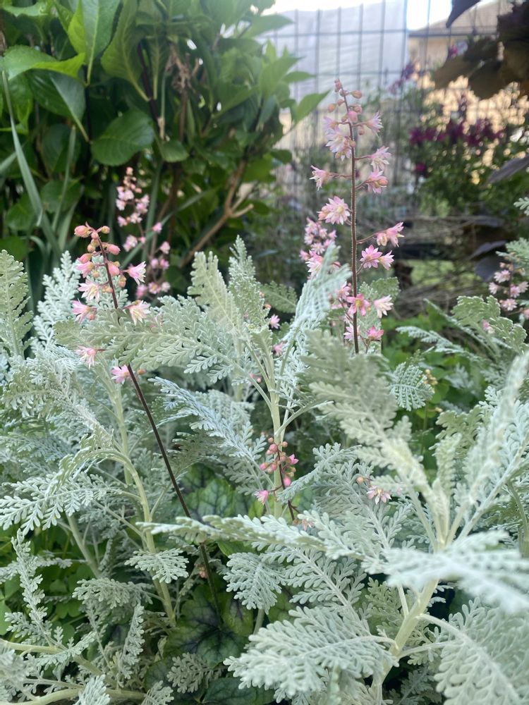 2️⃣白妙菊のシルバーリーフとティアレラの薄いピンクの花がちょうどマッチして幻想的✨
