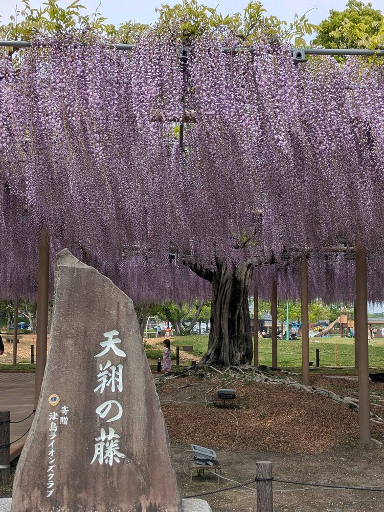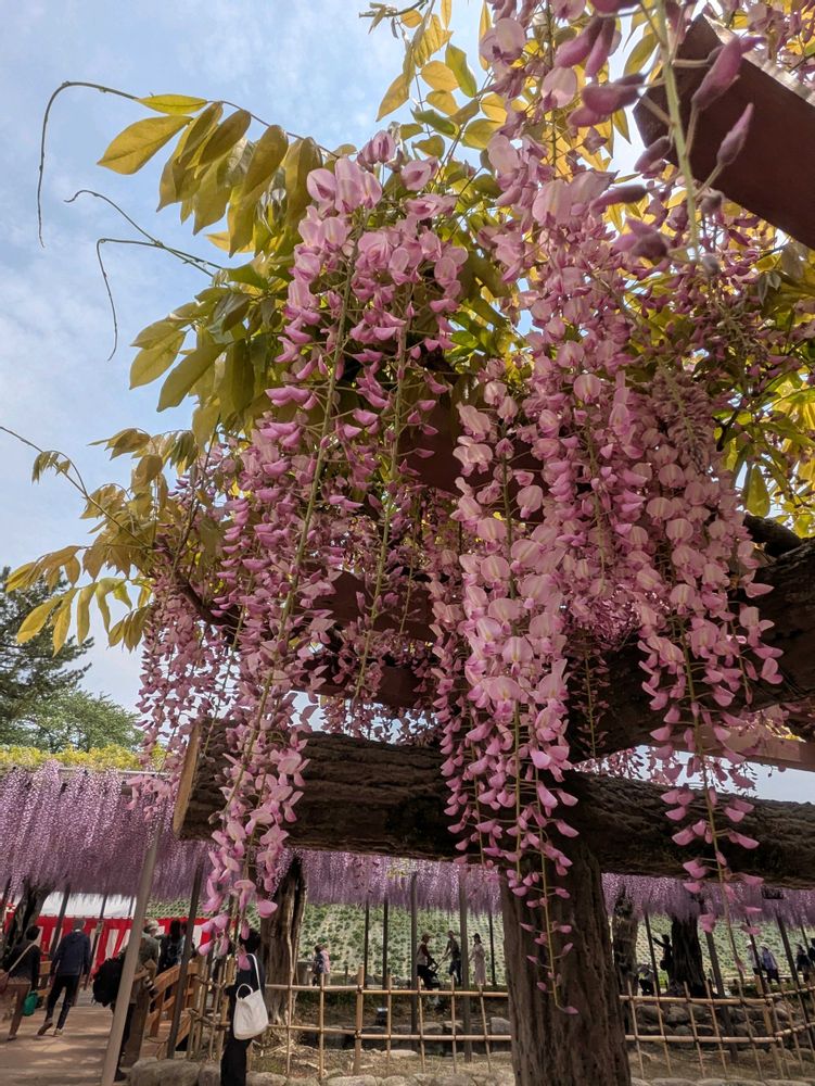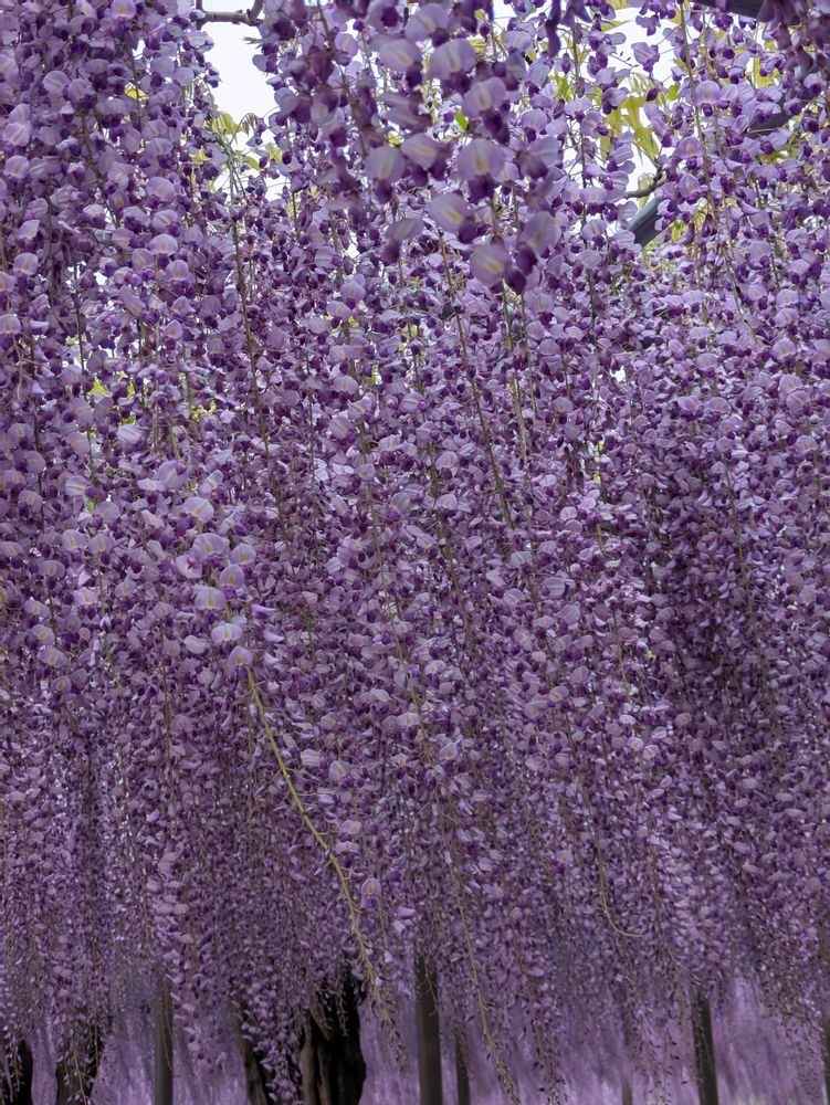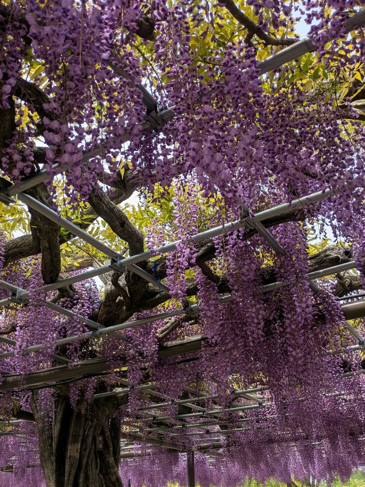 長さ275m、面積約5,000平方メートルの見事な藤棚があります。昼は風にそよぐ壮麗な藤を、夜はライトアップされた幻想的な風情 があります』
