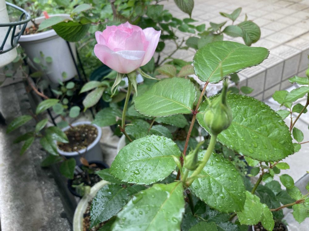 美しいピンクにいい香り。雨降りそうなのが残念…