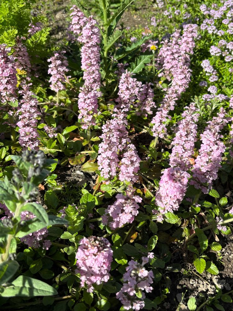 2枚目は畑側の花スペースに増殖中、ピンクのアジュガ