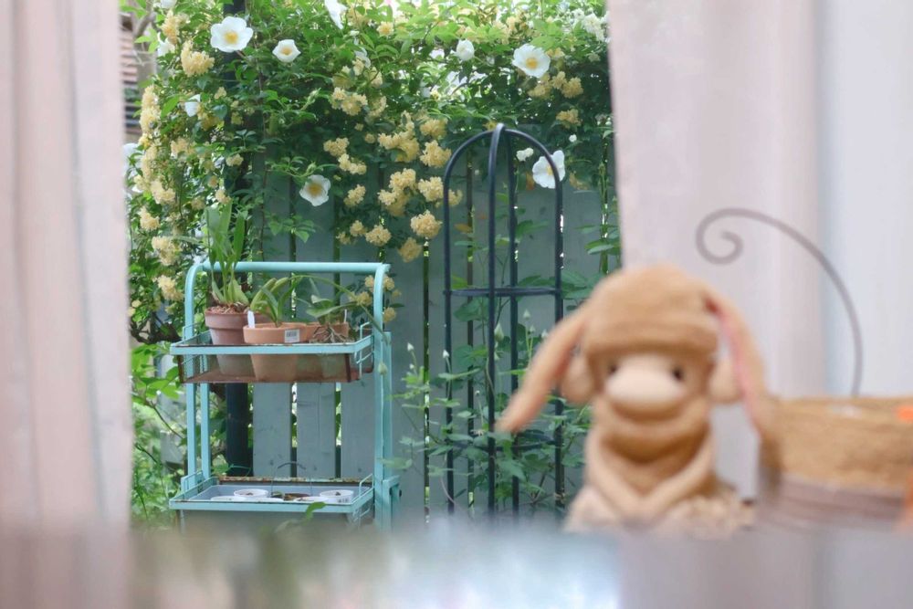 でもね〜 この掃き出し窓とウッドフェンスの約2メートルの間の足元は 養生中の鉢植えや やりかけのポット苗等がゴロゴロしてます🤣