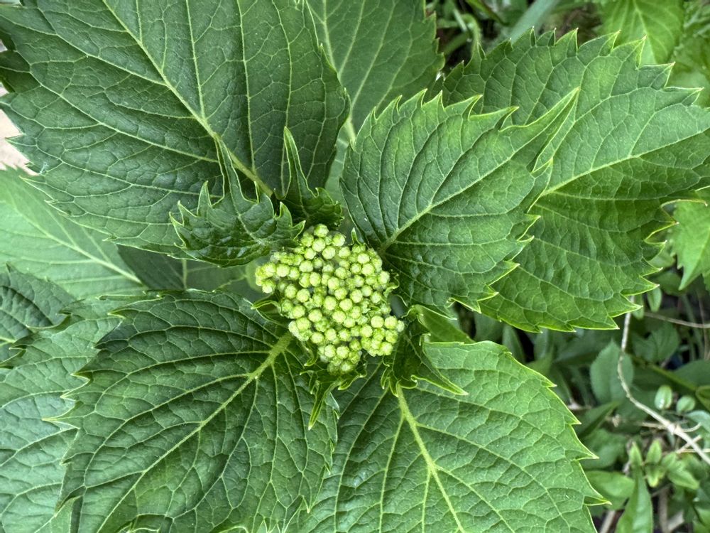 元町にガーデンベアが来ました。アジサイに蕾ができました。ボタンが300円なので買ってしまいました。
