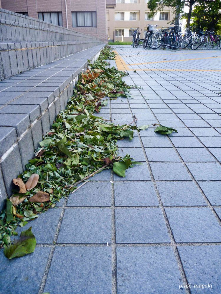 台風20号は中部地方を左にそれて通過していきました。前回ほど風も雨もひどくはありませんでしたが,校舎前の階段には,引きちぎられた葉っぱが緑色のまま吹きだまりを作っていました。