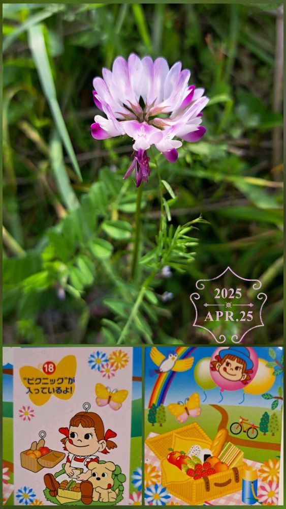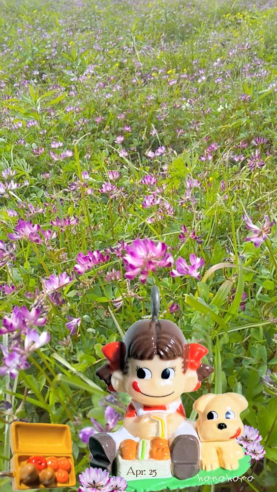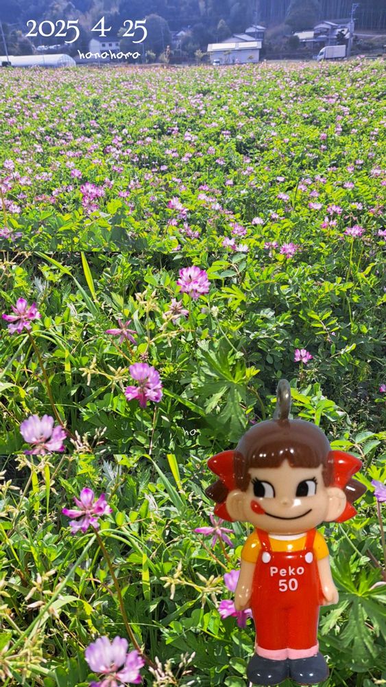 里山散策にてレンゲソウ畑とペコちゃん、ポコちゃんコラボ