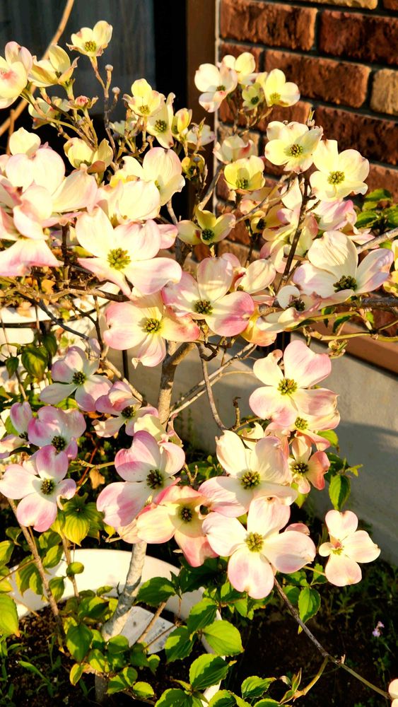 今朝の朝日を浴びた鉢植えの“レッドジャイアントハナミズキ”です