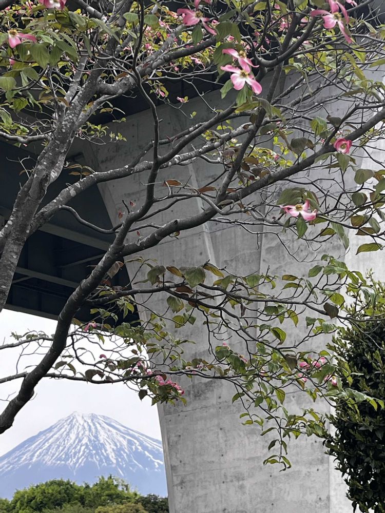 高架下遠く左に見えるいつもの富士山も移りゆく春景色を見てるのね❣️