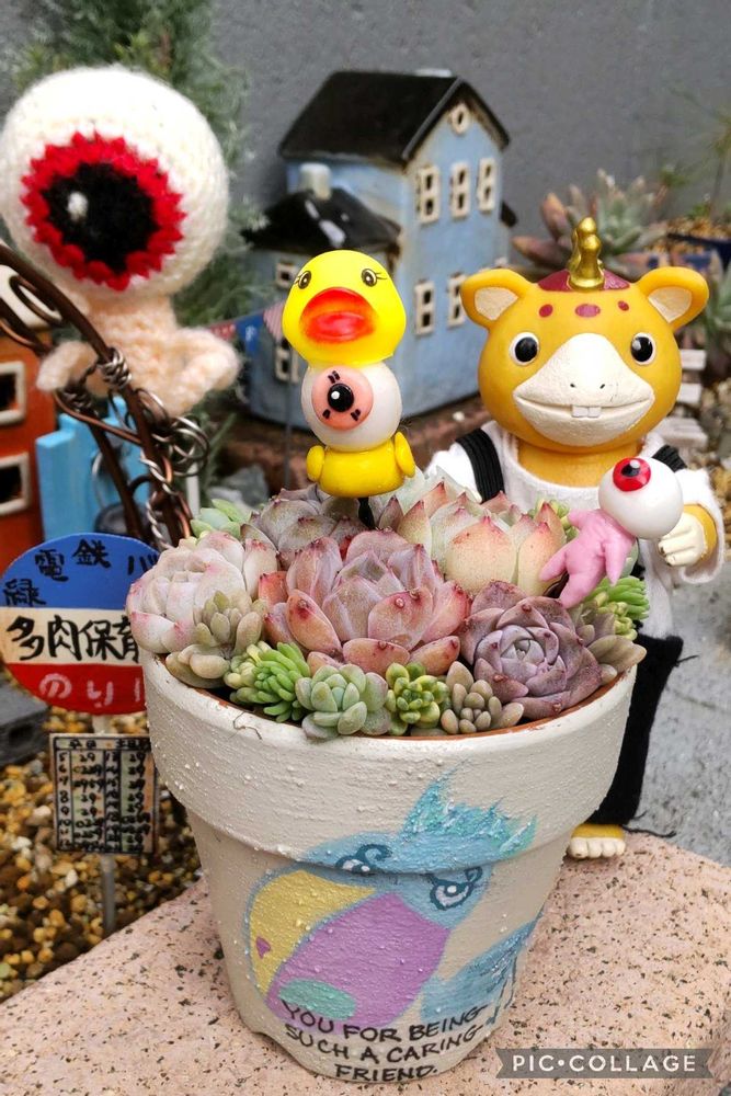 1枚目は、昨日届いた、ハシビロコウのリメ鉢に今朝、多肉弁当IN。