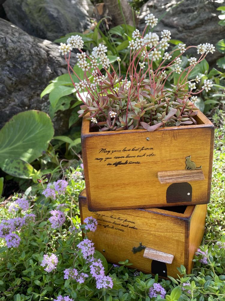 ①お酒の化粧箱をぶった切りまして🪚多肉用の木箱を2つ作りました。