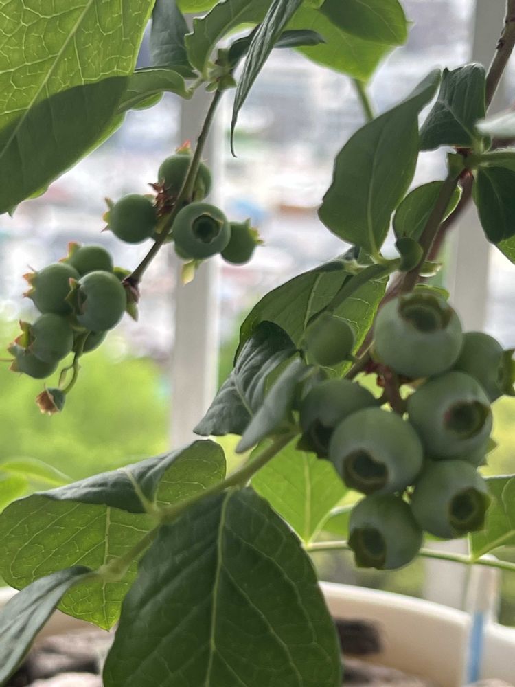 ベランダのブルーベリー。花はまだ少しありますがだいたいは咲き終わり、可愛らしい実をつけています。こちらも楽しみです。