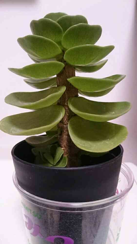 丸みのある葉っぱが、下から上まできれいに同じ列に、小皿を重ねるように四方に生えています。茎は、根元が1.5cm程あり、植木鉢の上端から最上段の葉っぱまでは9cm程です。葉っぱの形は、角の無い三角形状でスプーンのようにくぼんでいます。