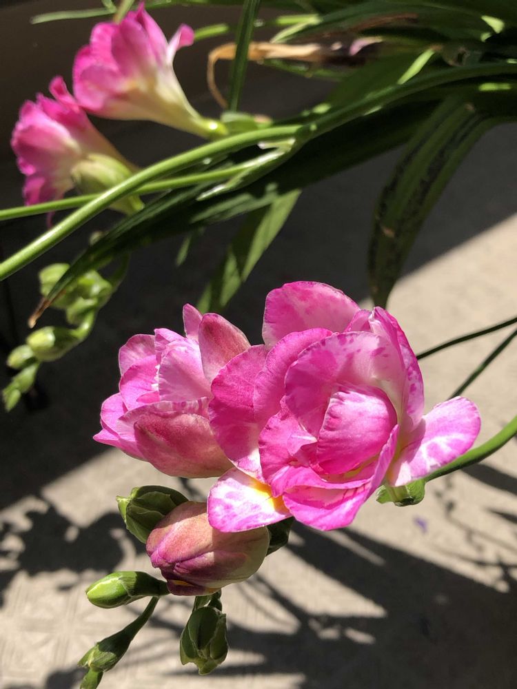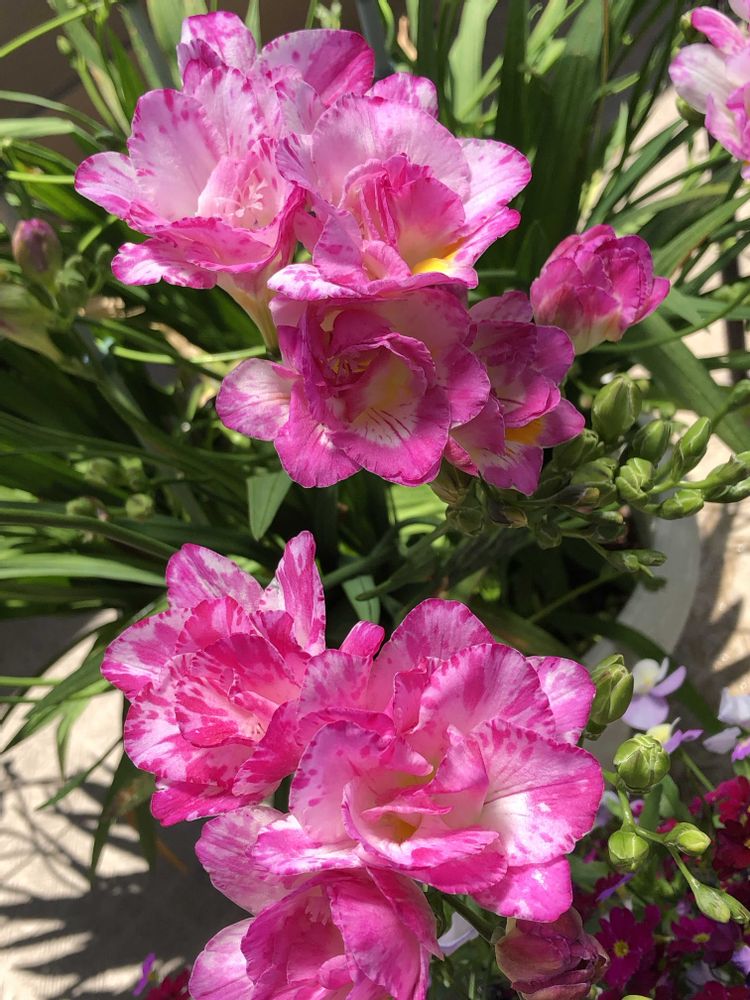 八重咲きフリージアの花が沢山開花して色もだいぶしっかりしたピンク色になって良い香りがします🌸