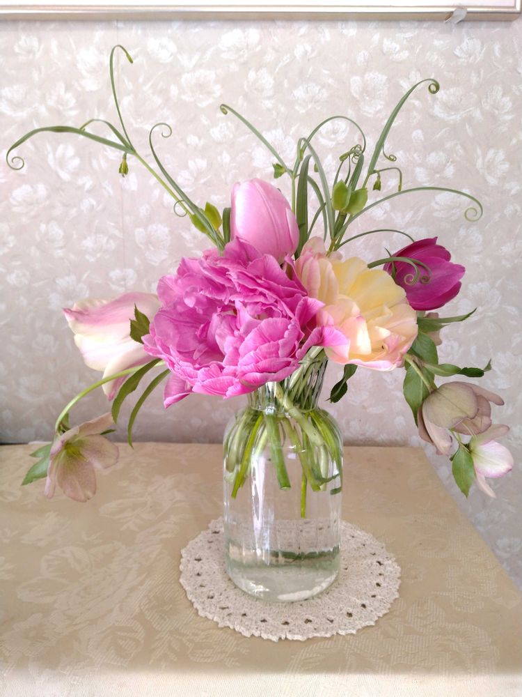 ヒヤシンスに使われた瓶、透明感が今日のお花たちを引き立ててくれますねー💕