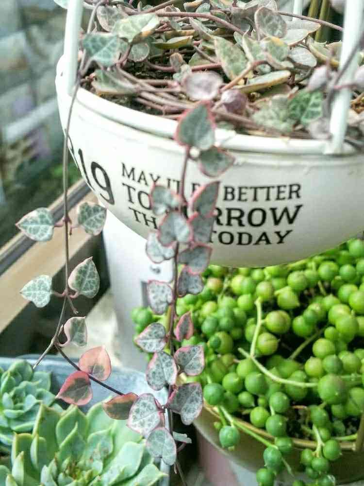 こんグリネ、しょっちゅう水やってる‼️去年は夏に焦がしちゃったから今年は遮光カーテンのなかで育ててみたの💚💚💚ハートカズラも松フラさんで買った💡型の鉢に植えたらいい感じになってきたよ❤️