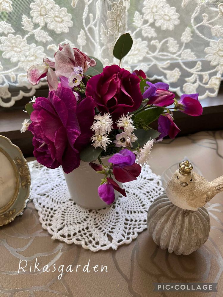 ①バラ ミステリューズが咲いてくれたので、スイートピーと飾ってみました。