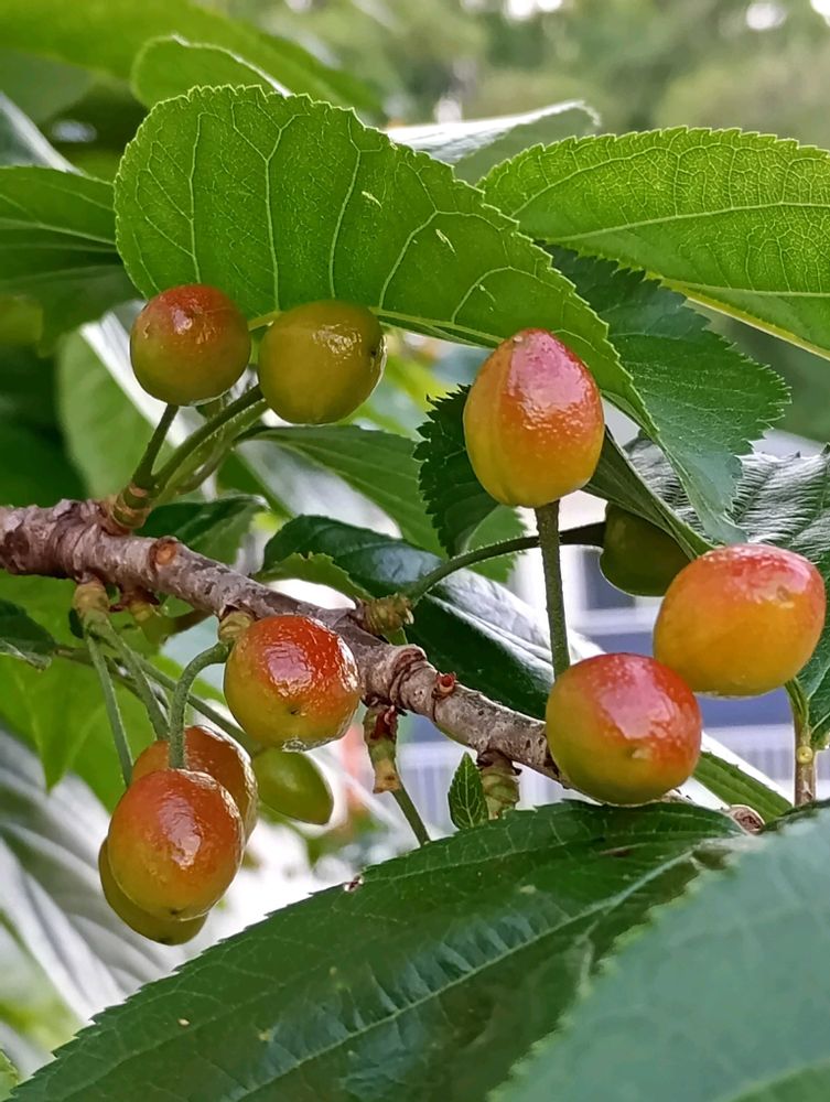 すぐ隣には三月にアップした、🍒サクランボの実が〜赤くなってきてました❤️ そろそろ、🐦鳥さんとの争奪戦も〜✌🏼