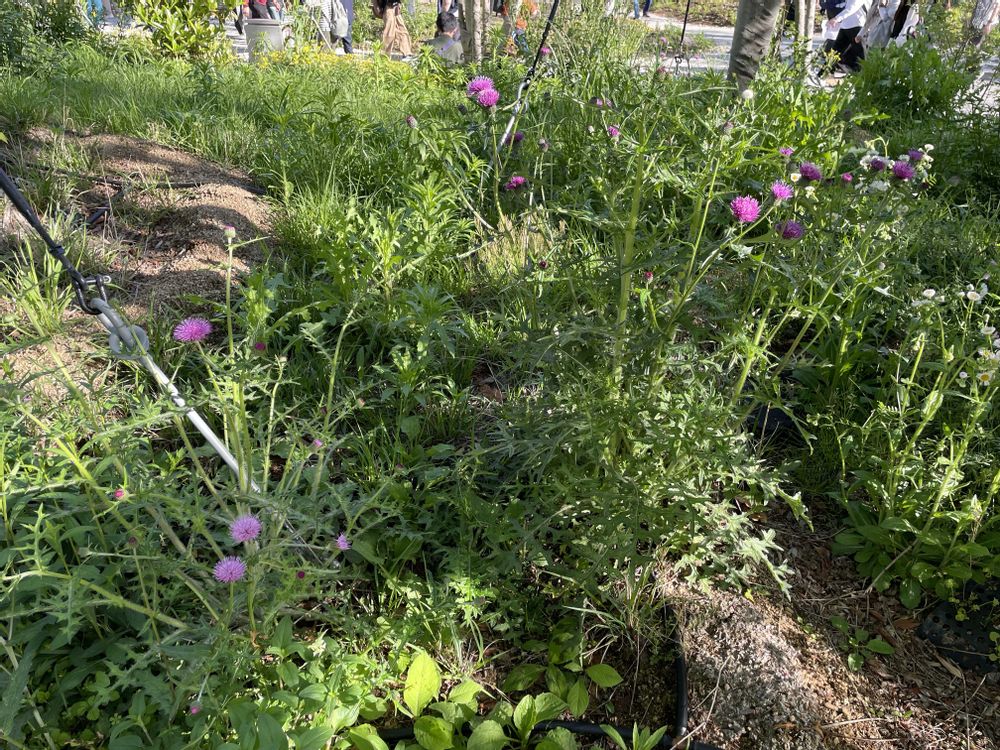 静けさの森にアザミがあちこちにいっぱい咲いてます。何アザミか?植えられたのか?もってきた土壌の中のタネか?どうなんかな?