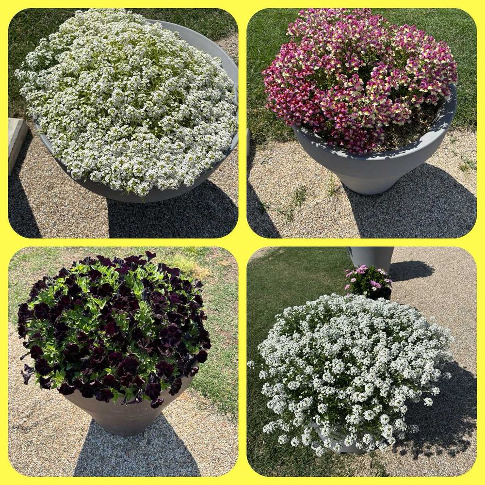 ❶ドットプランターがガーデン内に沢山並んでいました。水やり頻度を劇的に減らしてくれる物らしい。真夏でも2週間大丈夫だそうで、楽ちんですよね✨️