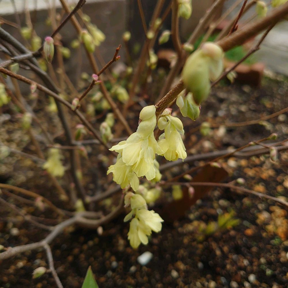 春一番に花木ではヒュウガミズキが咲きます レモンイエローの下向きの可愛い花
