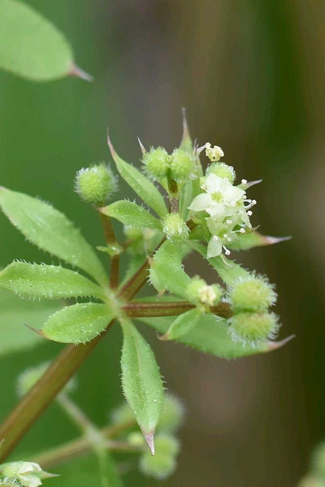 葉は6〜8個が輪生、広線形または狭倒披針形、先端は刺状にとがり、縁と裏面の主脈には逆向きの刺。茎の先や葉腋から花序をだし、小さな黄緑色の花をつける。花冠は4裂、4個の雄蕊。