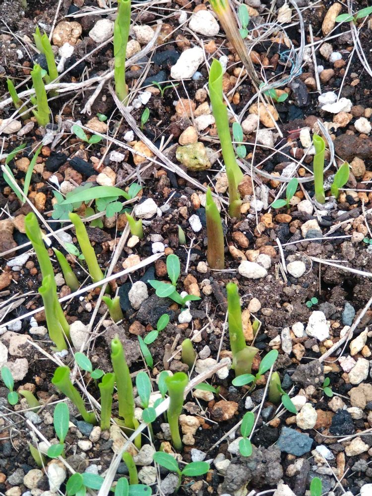 小町りんどう可愛く咲いてます。長年育てて怖くて地植え出来ない。カラーの芽とわざとここに落ちるようにした日々草の零れ種