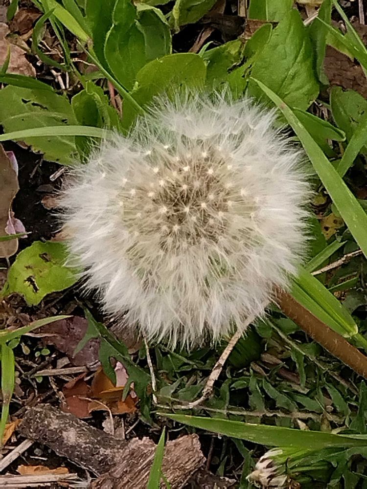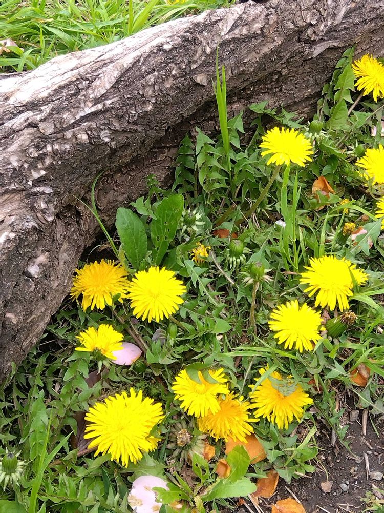 たんぽぽが切り株の根元にたくさん🟡綿毛もフワフワ