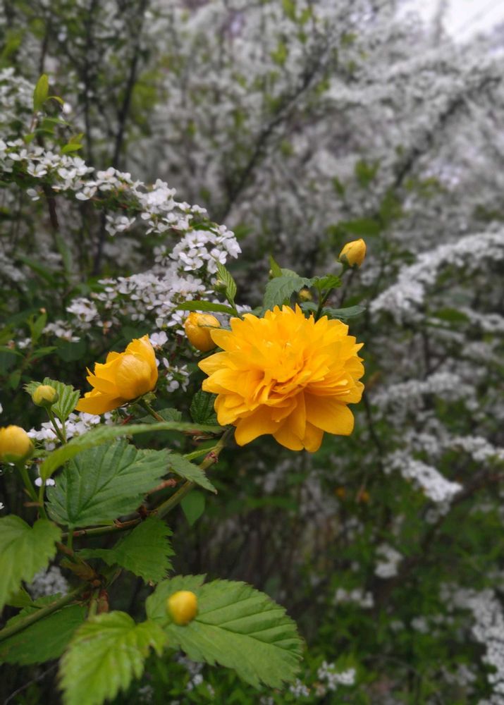 ③ユキヤナギの間から八重のヤマブキも🤍✨🤍