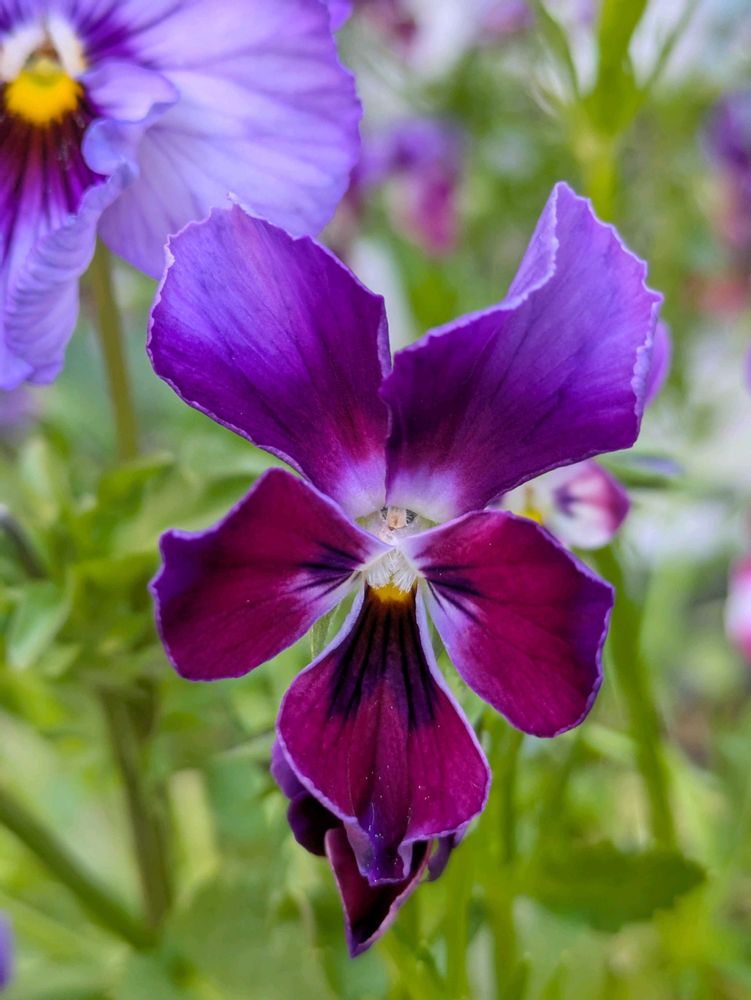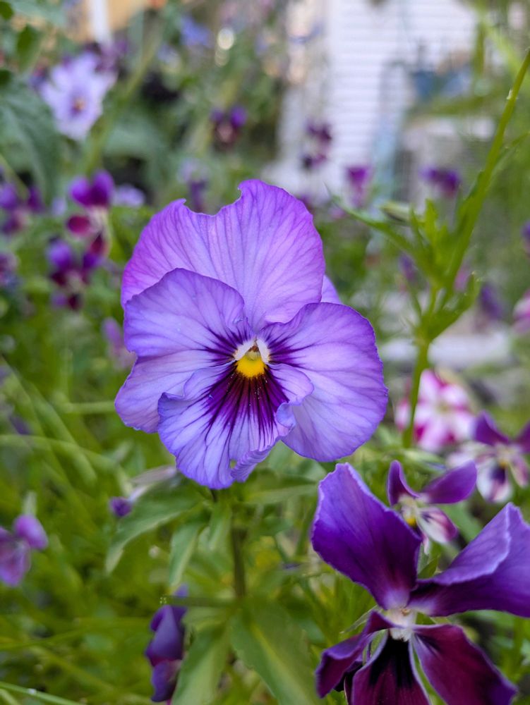 ビオラは切り戻しの時期が分からない。花が傷むと、その花だけ指で摘んでいます。