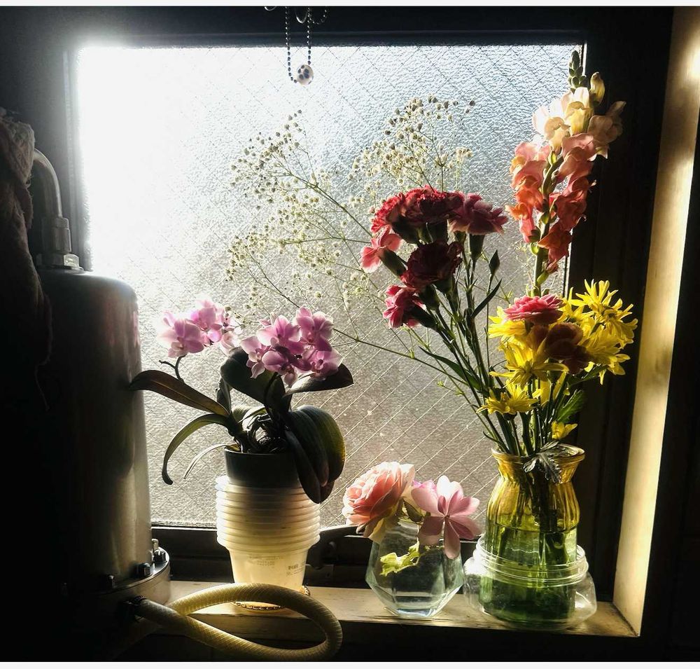 📝キッチンの出窓に飾っている花華たちを、窓越しに朝陽がさして照らしています。
