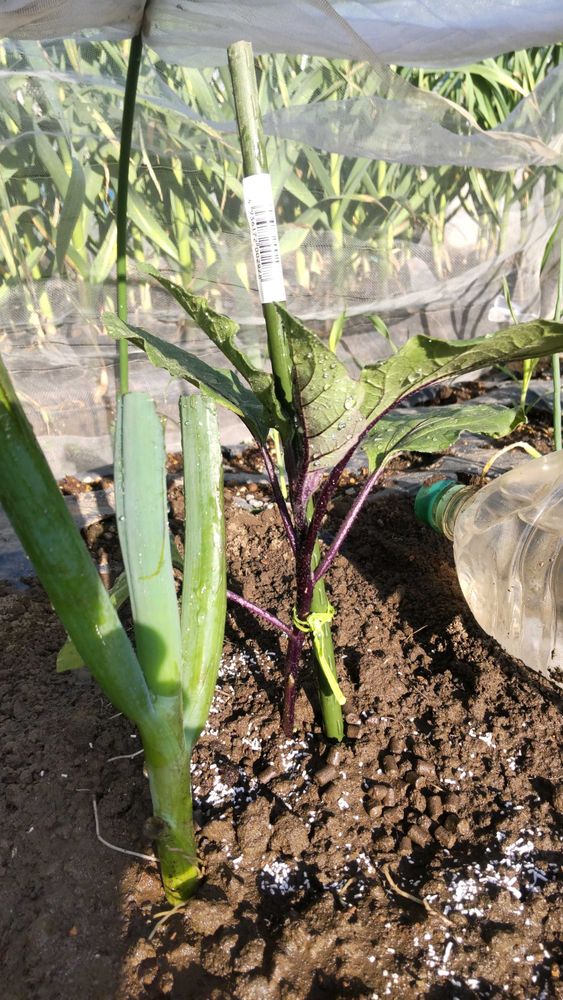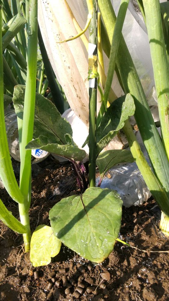 あ〜茄子の横にネギ。ネギを一緒に植えたら、やっぱり違いますか?