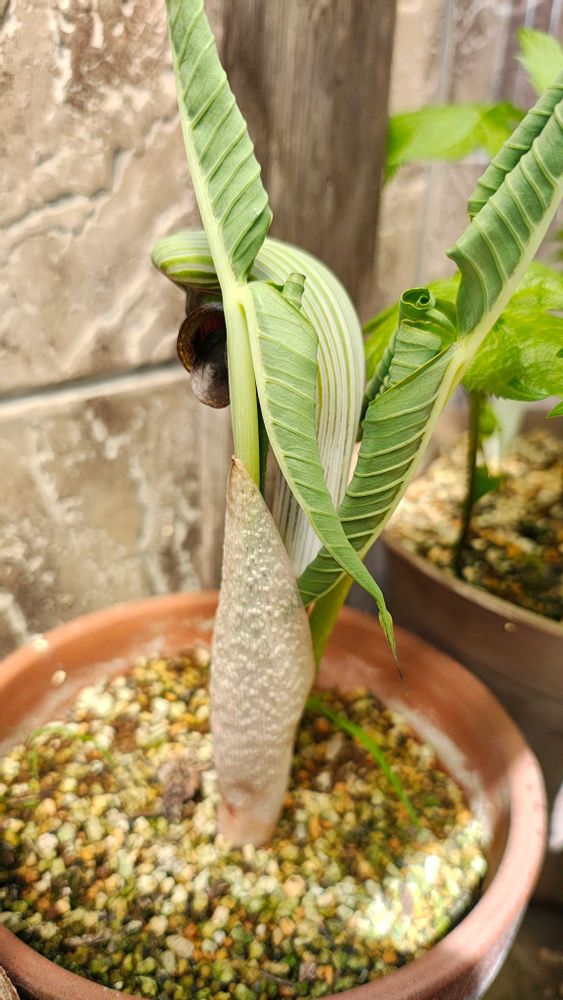 ウチのムサシ、片方仏炎苞が緑なんだけど、中は普通に茶色なので素心でもない、曖昧なやつです。