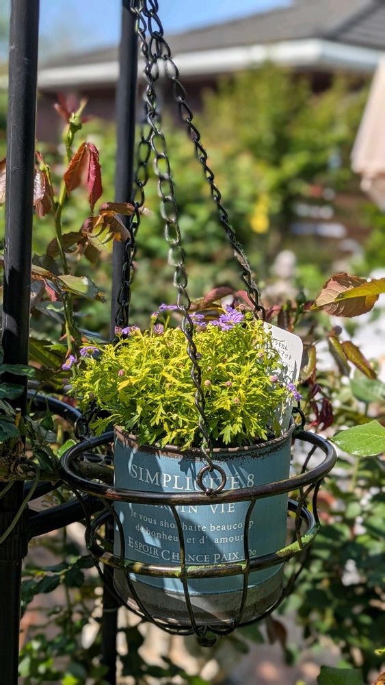 古花市でアイアンのハンギングバスケットを買いました😊さっそく下げました🧺