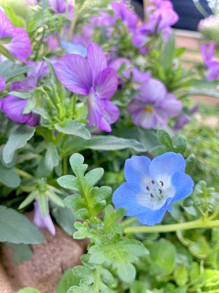 庭のオリーブ下花壇のビオラの隙間から、去年植えていたネモフィラの零れ種が咲いていました(*´◒`*)🩵
