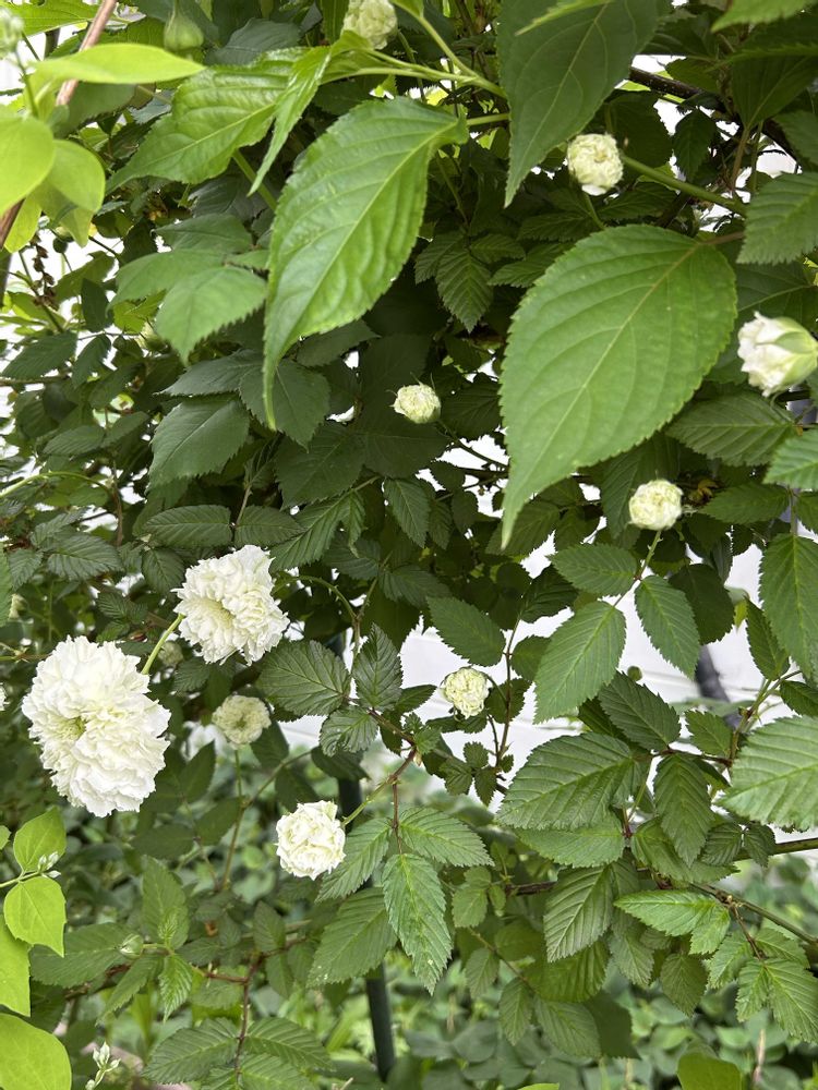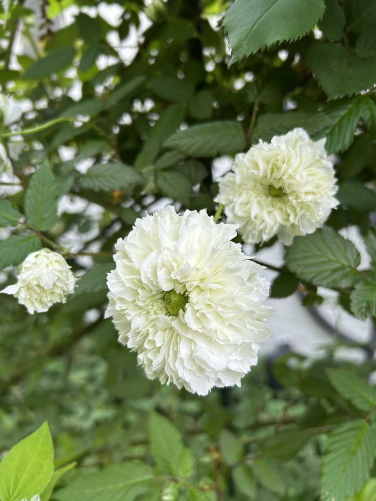 別名ボタンイバラ。花径約6cmほどの美しいポンポンの花。キイチゴの仲間で、名前はバラのように美しい花に由来するらしいです😊