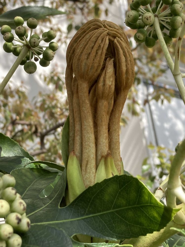 ヤツデの新芽、ひとつの塊の中から、手を小さく丸めたような形✊️の葉っぱを広げながら🖐️伸びていく•••、そんな感じでしょうか!?