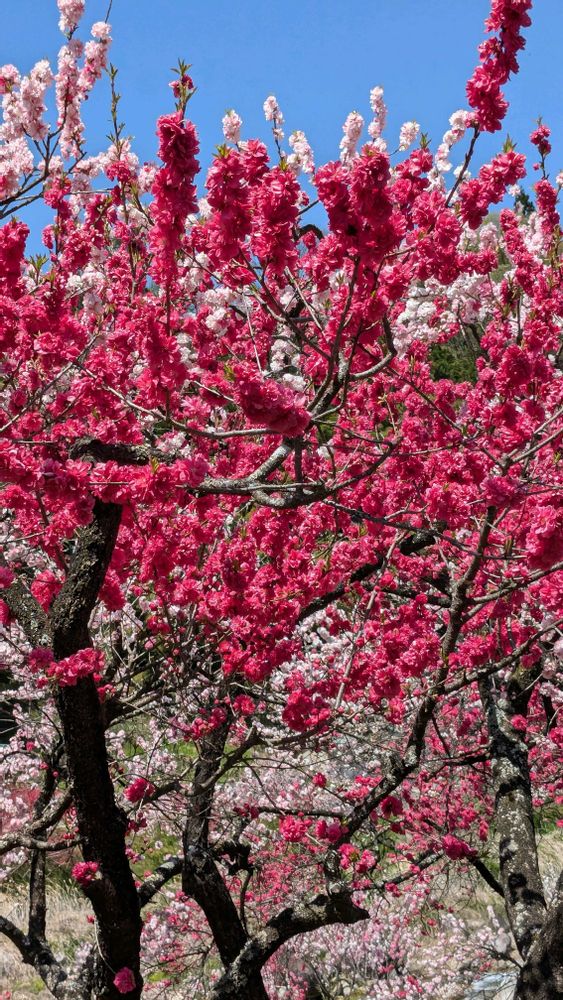 見頃を迎え 紅白の鮮やかなコントラストを見せるハナモモ