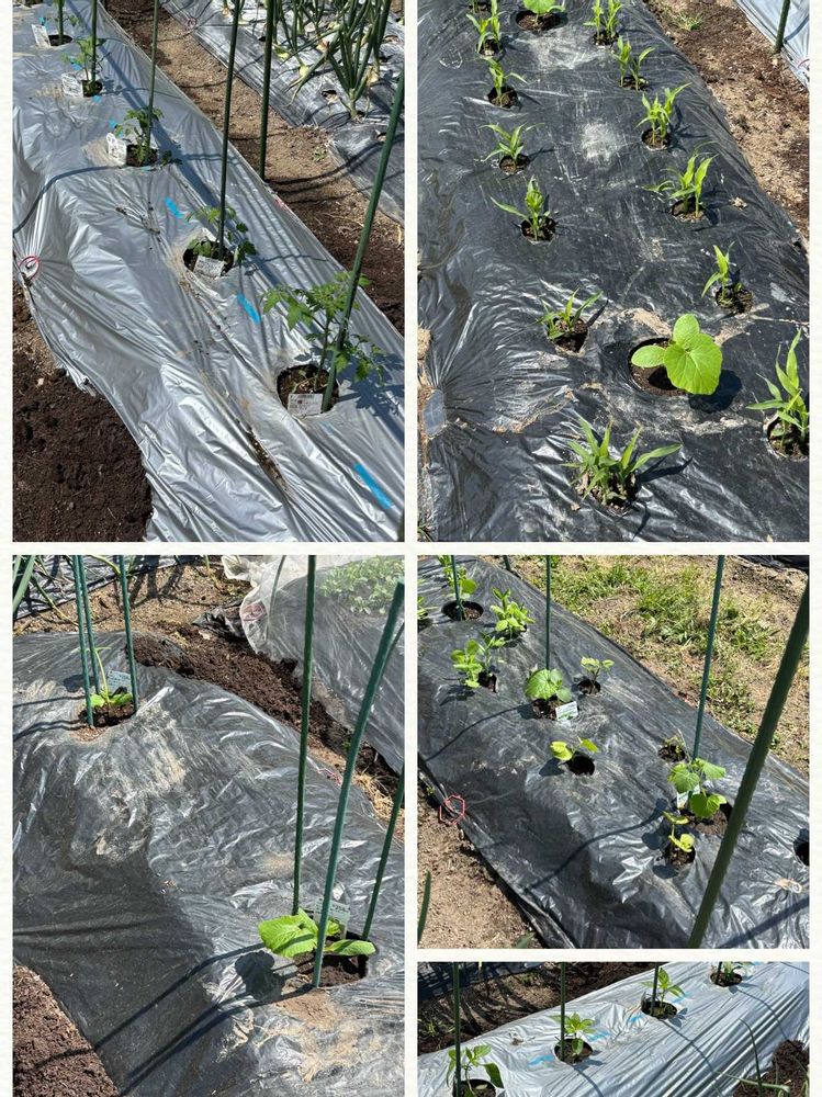 トウモロコシの間にかぼちゃの苗、蔓なしインゲンの間にキュウリの苗を植栽しましたー