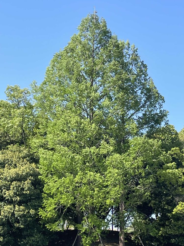 3本のメタセコイアが寄り添うように立っているのですが、若葉が茂って幹が見えなくなり、1本の大きな木のように見えます。